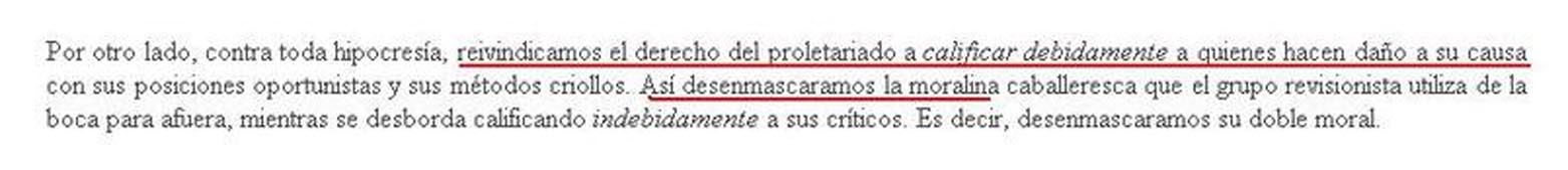 Si me intereso por Ud y su cenáculo, es porque hay un significativo grupo de compañeros que honestamente adhieren al socialismo marxista y que sufren de esa misma tara, esa misma desviación, llevan esa misma práxis perniciosa: rumiar en libros, citas, folletos, buscando en ellos la verdad y no en los hechos y en la vida y formar sectas de "iniciados" que compiten entre sí, mientras las masas permanecen allí, huérfanas, desconectadas del Socialismo. Esto significa una verdadera tragedia en el campo de la revolución.